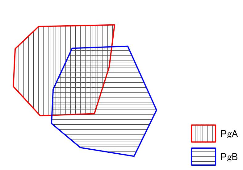 ここで、下記のように2つの図形(PgAとPgB)があった場合に、PgAのメソッドで空間解析を実施した場合について、その出力結果を見てみます。